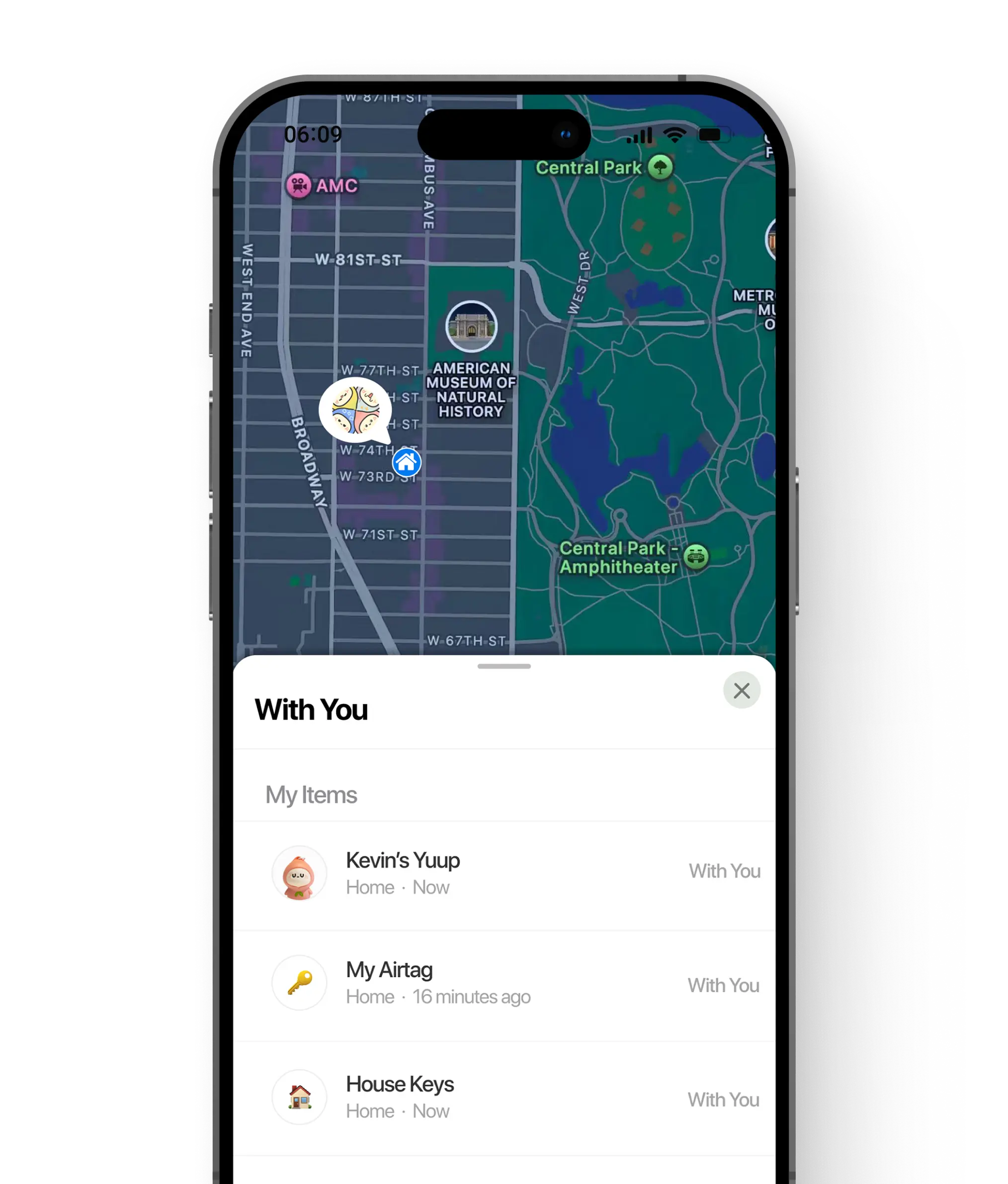 Yuup plugs into Apple Find My and shows up right inside the Apple Find My app — see its current or last known location on a map and navigate right to it.
